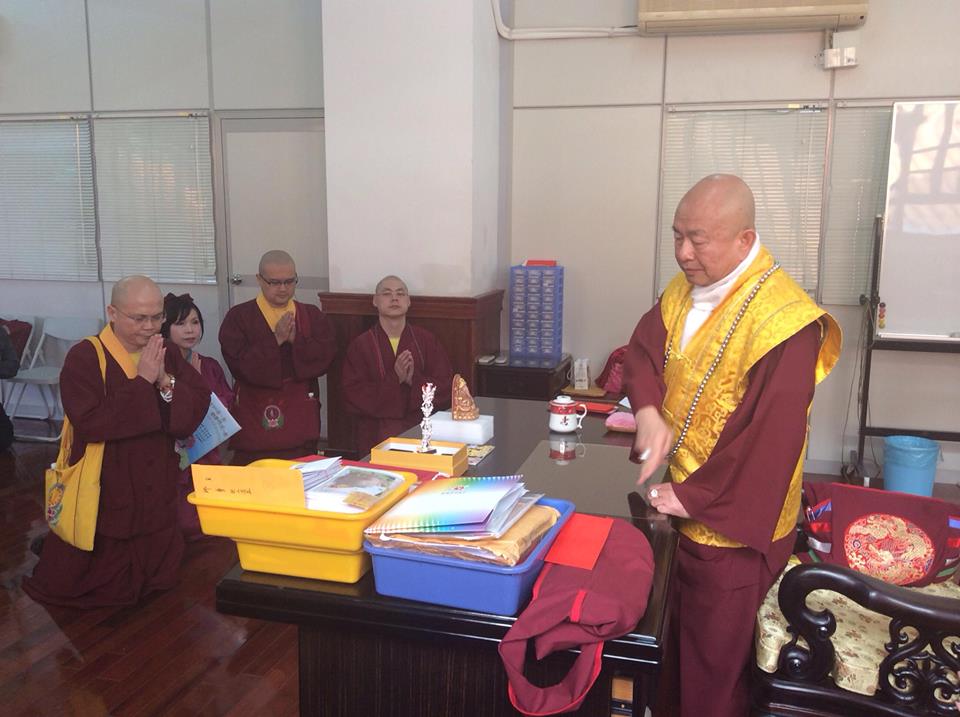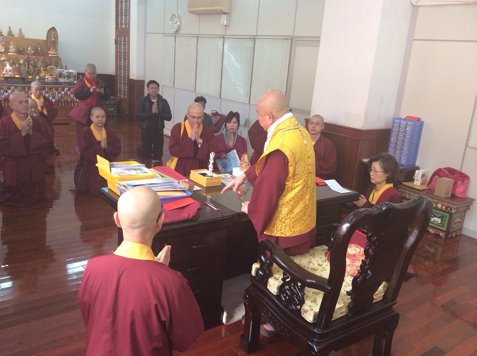 蓮生活佛 盧勝彥法王於〈台灣雷藏寺〉六樓加持全世界弟子信件及處理宗務情景之二。
