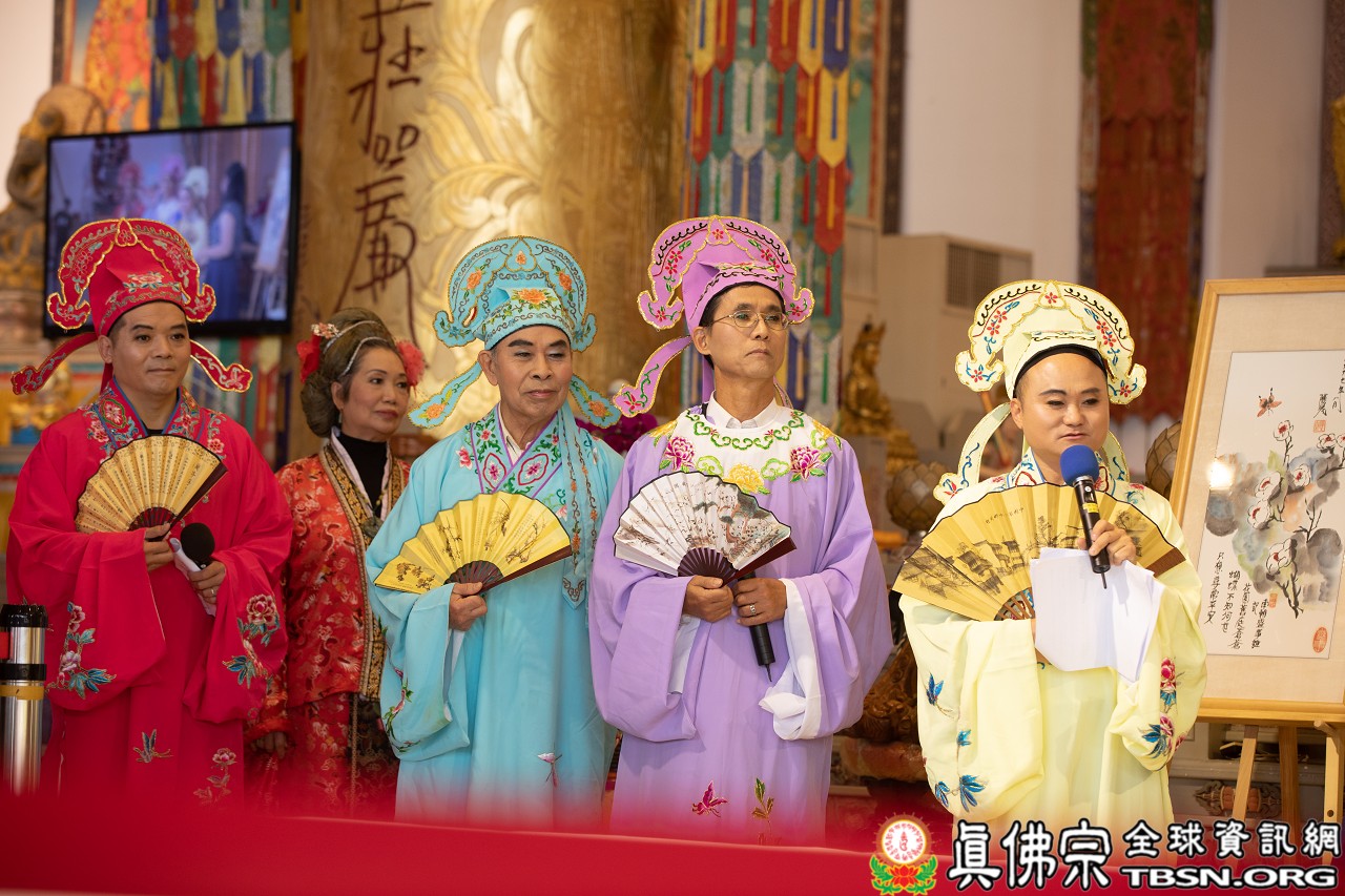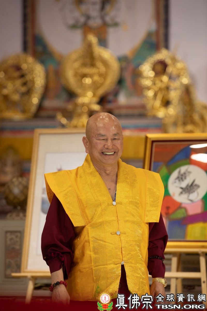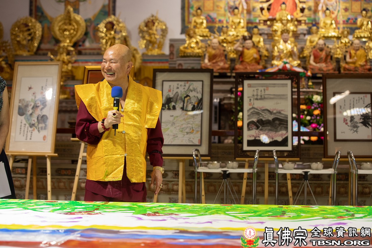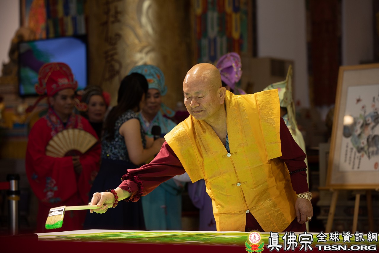 此次法王作家創作有別於前,首次嚐試以壓克力顏料方式揮灑彩墨,主辦單位大燈文化現場搭配鋼琴、古箏音樂演奏及天女獻舞,使會場充滿文藝氣息,同時穿插江南四大才子劇情演出,幽默逗趣。與會信眾盡情觀賞法王神來之筆,自然天成。