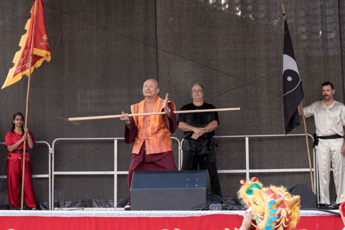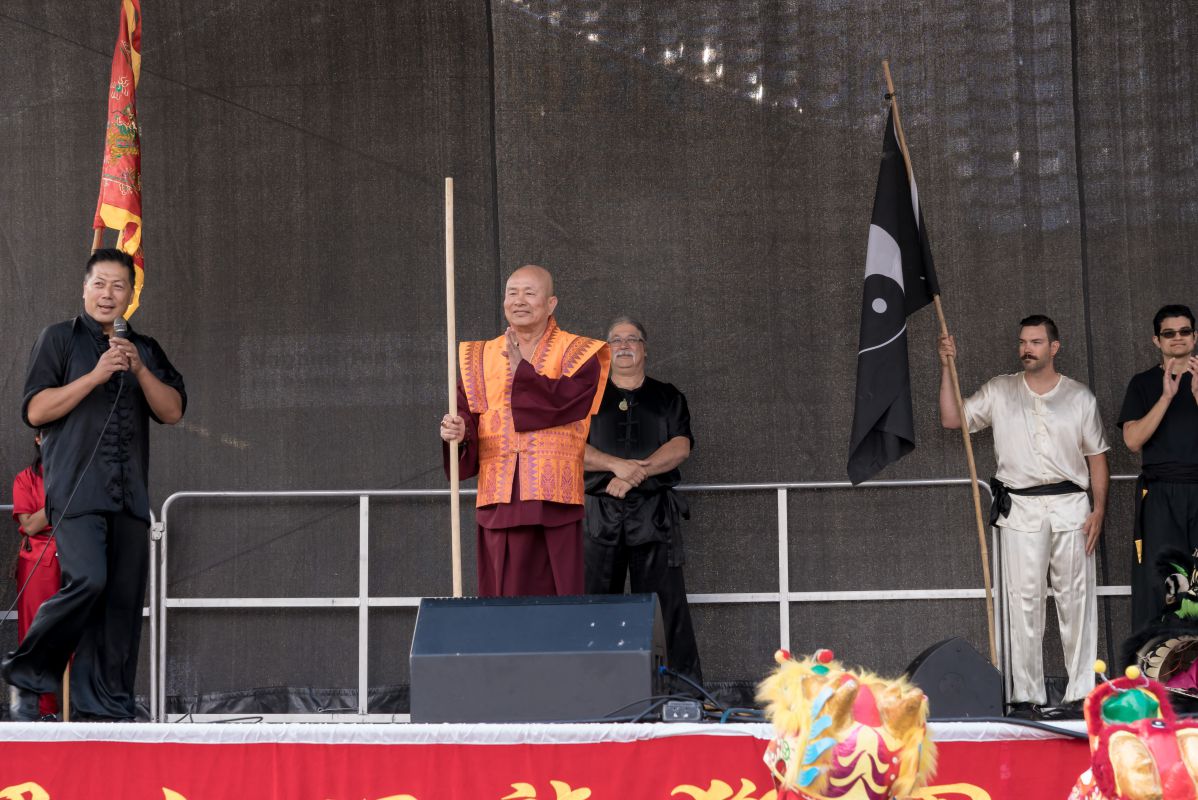 在參觀龍節各項活動及攤位時,蓮生活佛 盧勝彥也受全美電視卓鴻儀先生以及梁文輝師傅的邀請下,接受採訪並於龍節活動舞台上演化金剛棍使得與會大眾,目不轉睛,連連叫好更添此次慶典熱鬧光輝!