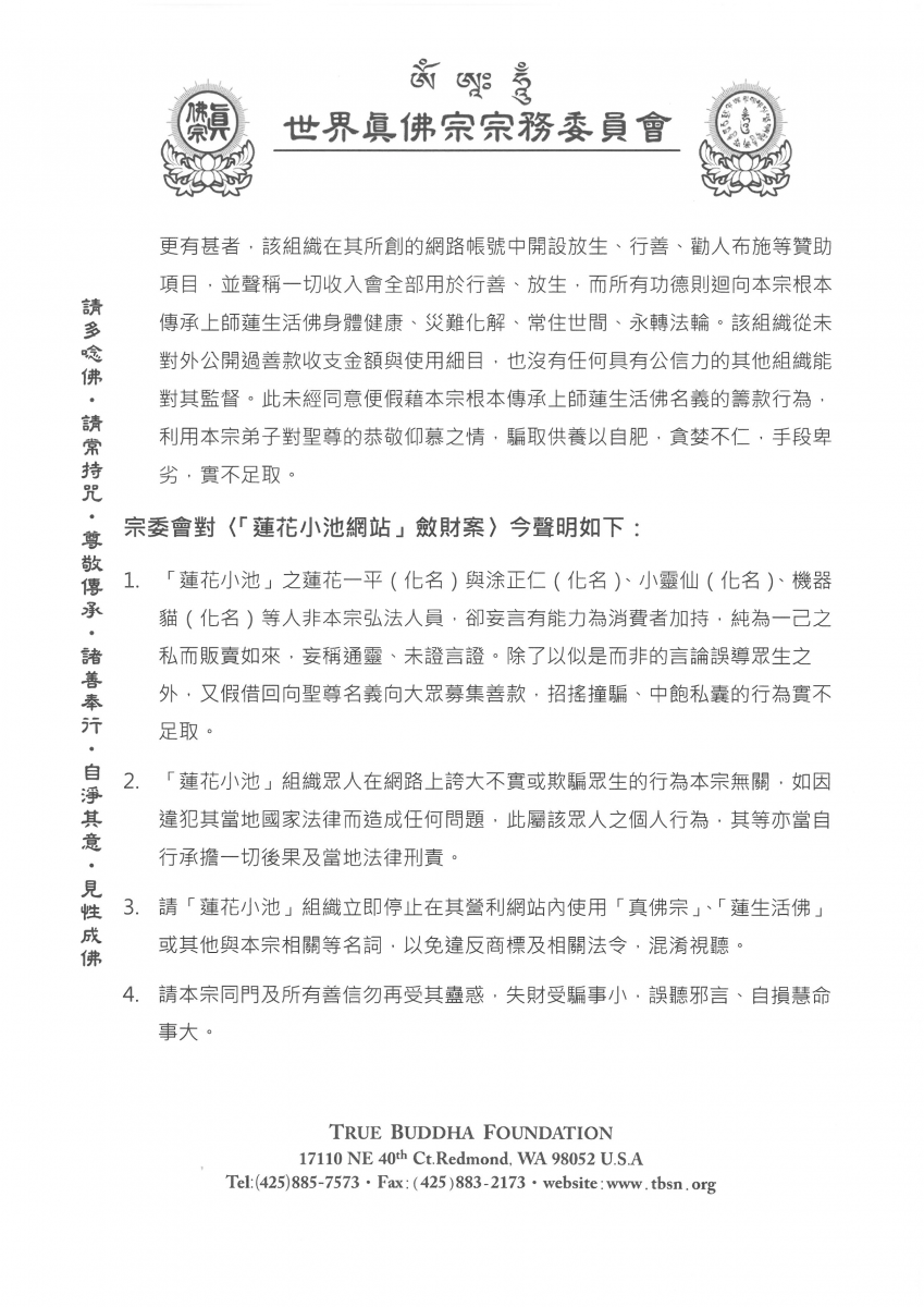 「蓮花小池」組織眾人在網路上誇大不實或欺騙眾生的行為本宗無關,如因違犯其當地國家法律而造成任何問題,此屬該眾人之個人行為,其等亦當自行承擔一切後果及當地法律刑責。