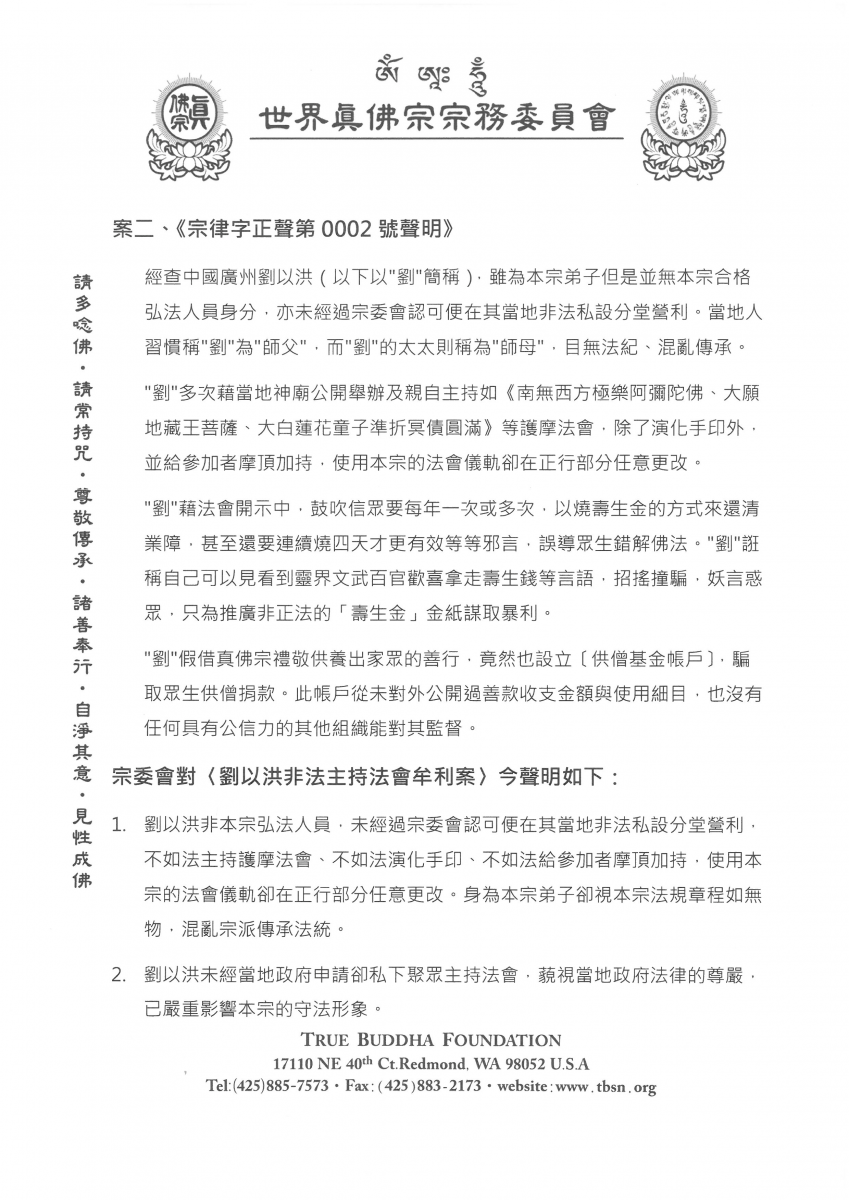 《宗律字正聲第0002號聲明》_〈劉以洪非法主持法會牟利案〉
