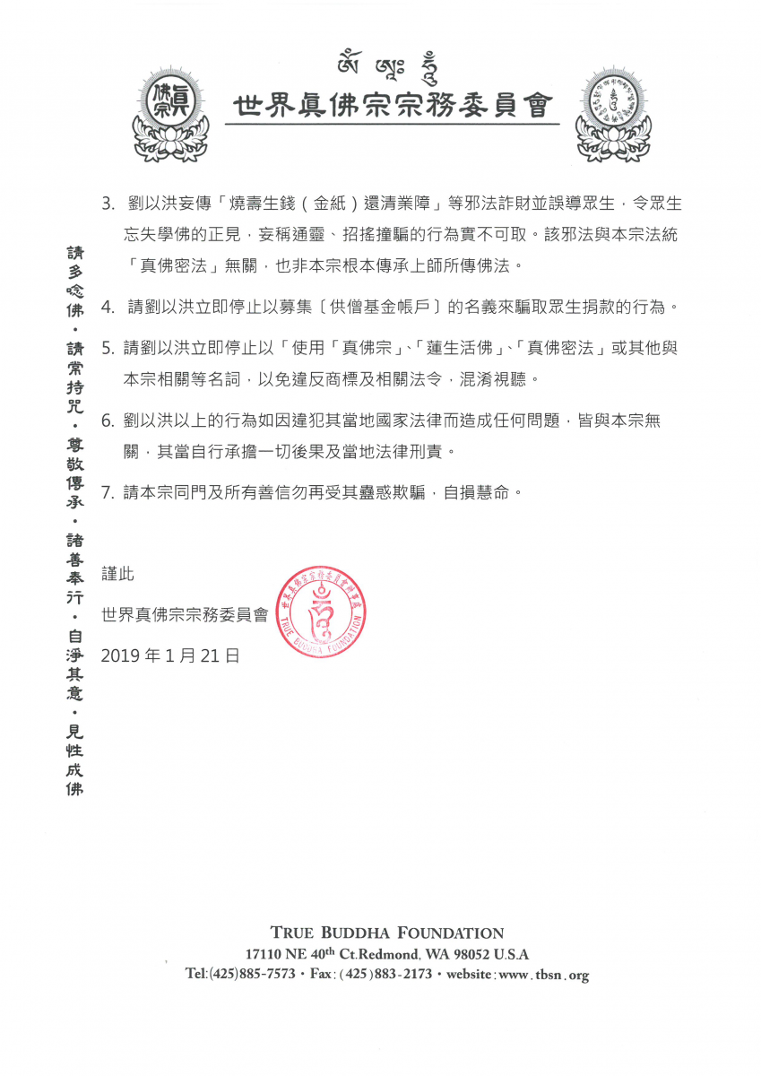請劉以洪立即停止以募集〔供僧基金帳戶〕的名義來騙取眾生捐款的行為。
