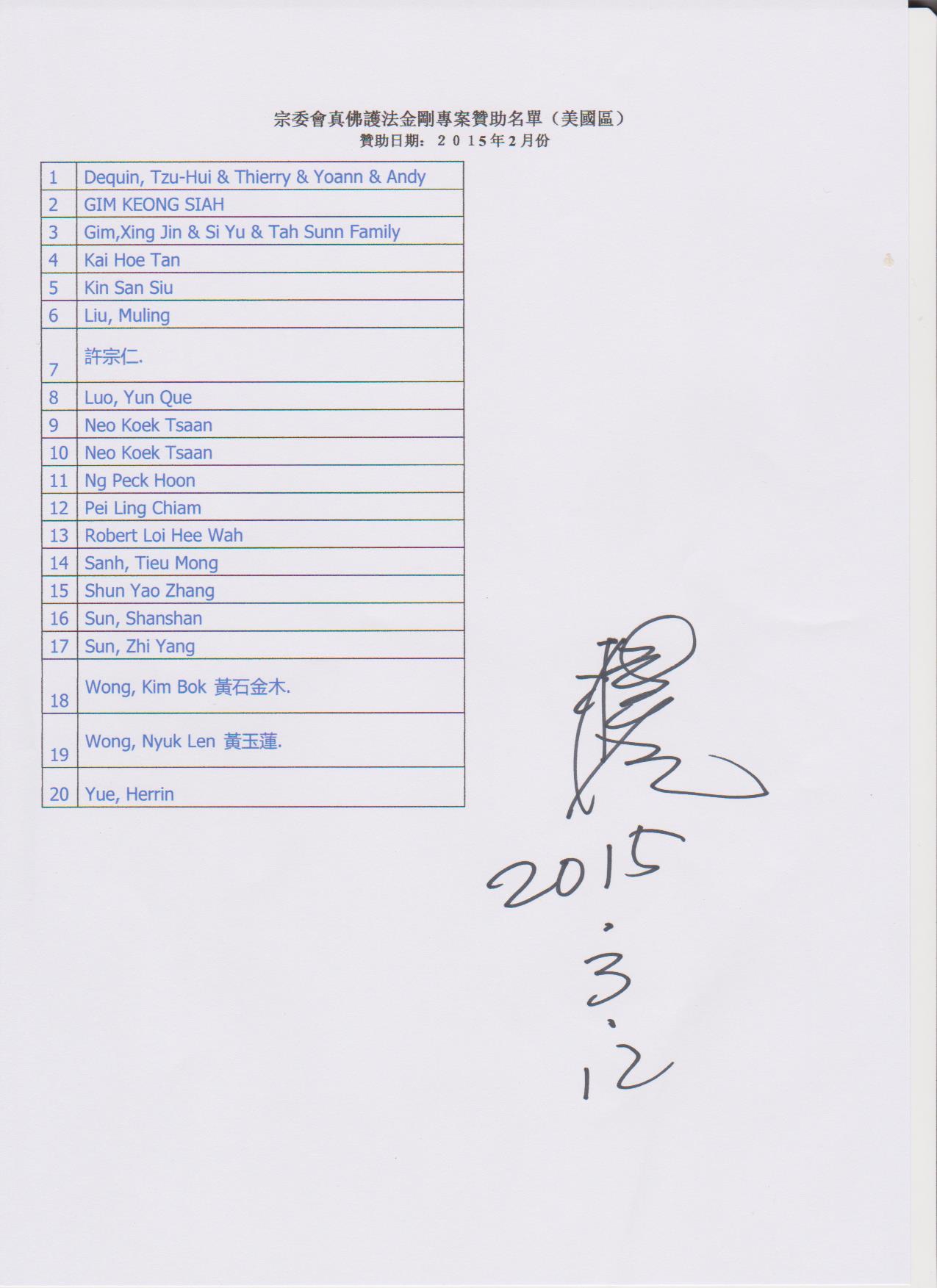 【宗委會 通告】感恩 蓮生活佛 盧勝彥法王慈悲加持2015.1.1 ~2.28【真佛護法金剛榜】贊助者名單