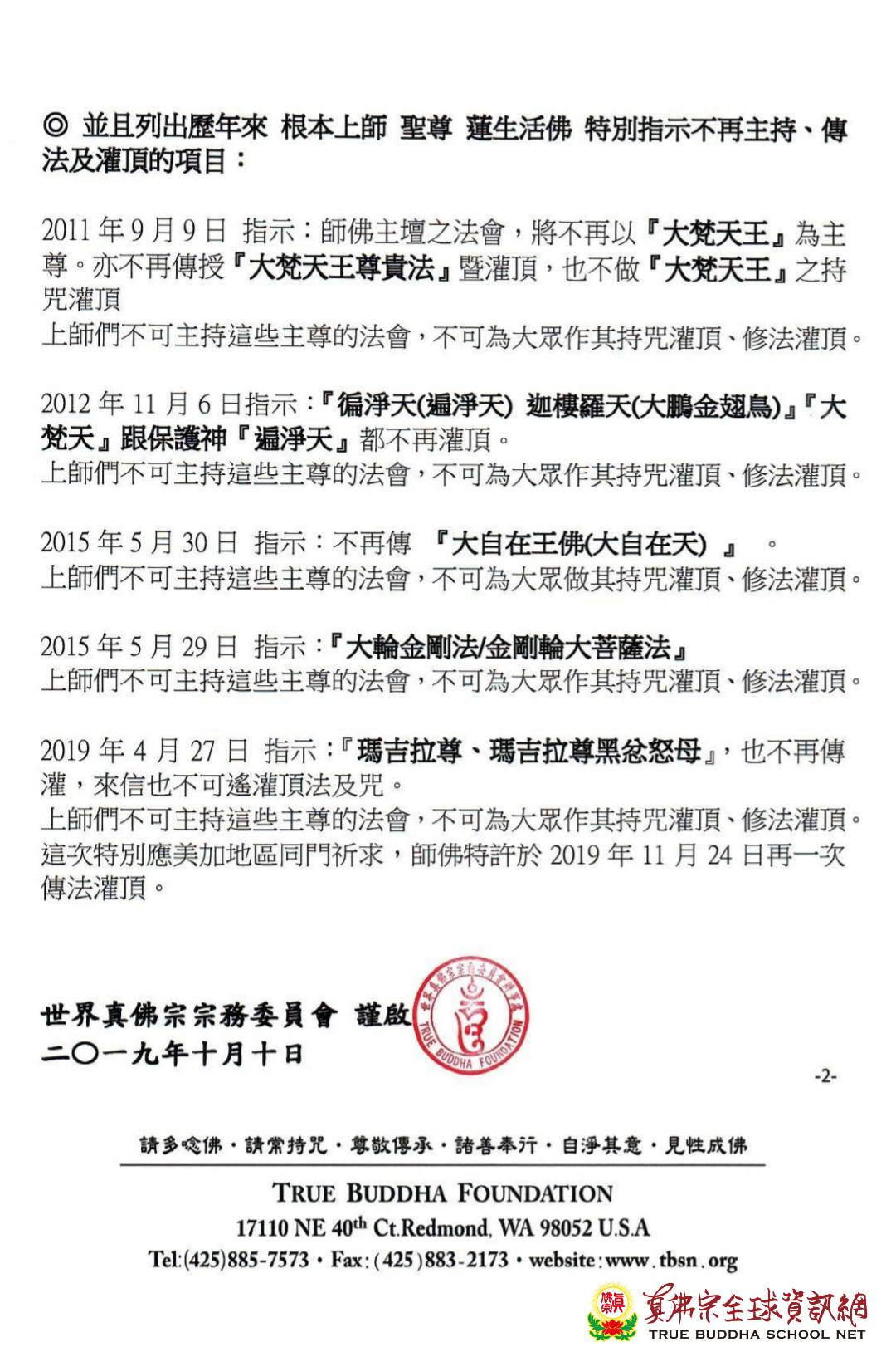2011年9月9日 指示:師佛主壇之法會,將不再以『大梵天王』為主尊。亦不再傳授『大梵天王尊貴法』暨灌頂,也不做『大梵天王』之持咒灌頂