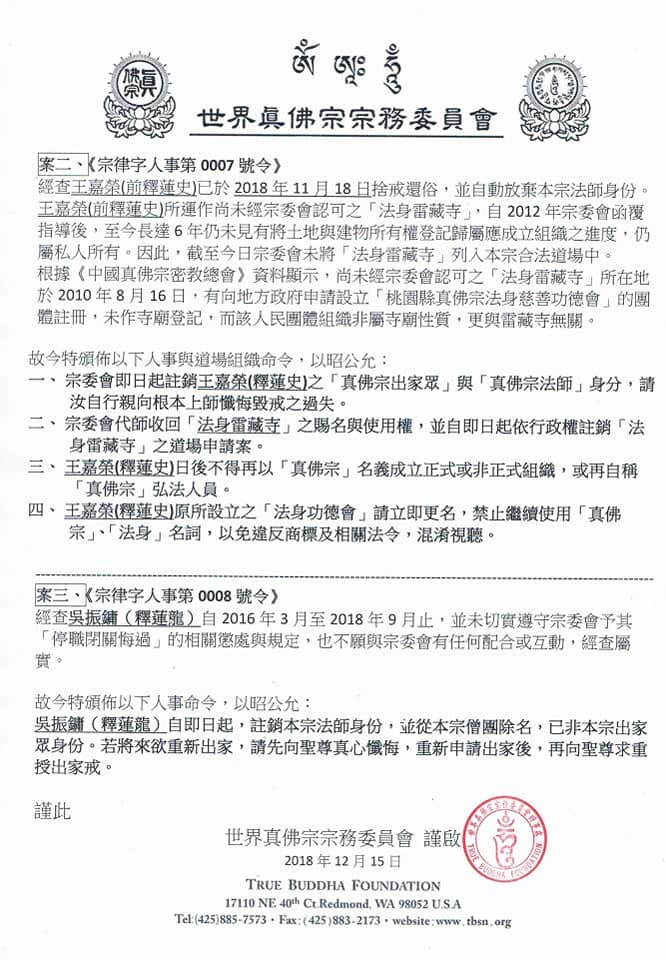 以上諸案皆由《宗委會》依職權確立人事懲處裁示,並經由本宗《監察會》作最後覆審確認後執行之。今特頒佈(人員及道場)人事命令,以昭公聽。