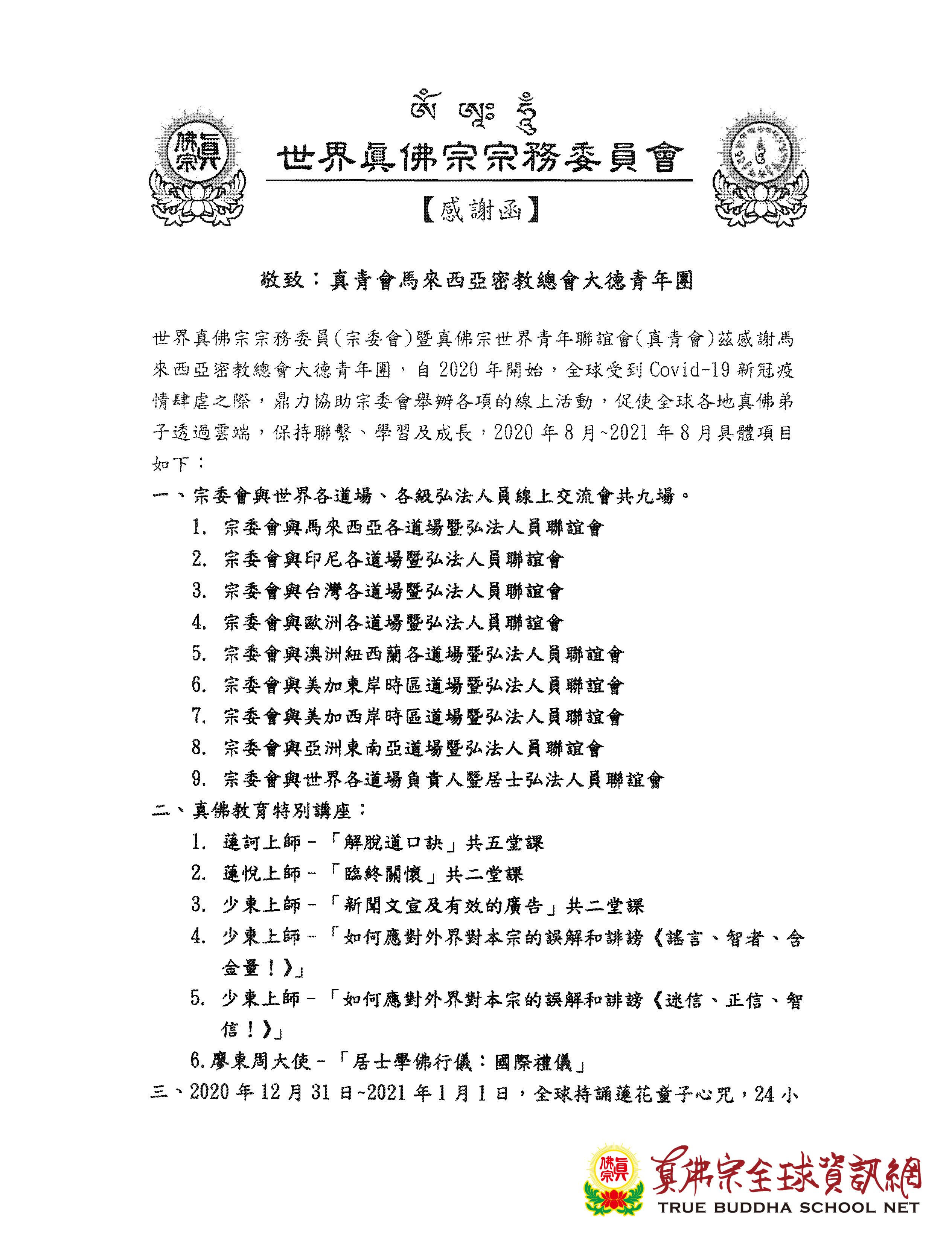 世界真佛宗宗務委員(宗委會)暨真佛宗世界青年聯誼會(真青會)茲感謝馬來西亞密教總會大德青年團,自2020年開始,全球受到Covid-19新冠疫情肆虐之際,鼎力協助宗委會舉辦各項的線上活動,促使全球各地真佛弟子透過雲端,保持聯繫、學習及成長,2020年8月~2021年8月具體項目如下: