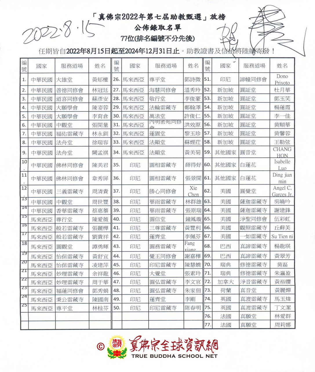 真佛宗2022年第七屆助教甄選結果,於2022年8月《宗委會核心小組》專案討論審核,報名參加「真佛法學堂」自2021年6月5日開始上課,歷經一年多,二個階段的培訓,線上課程及小考、梵唄、課堂出席率及道場實習、綜合大會考筆試、面試等總成績評鑑後,共錄取77位名額,升任真佛宗助教。(錄取名單如附件)