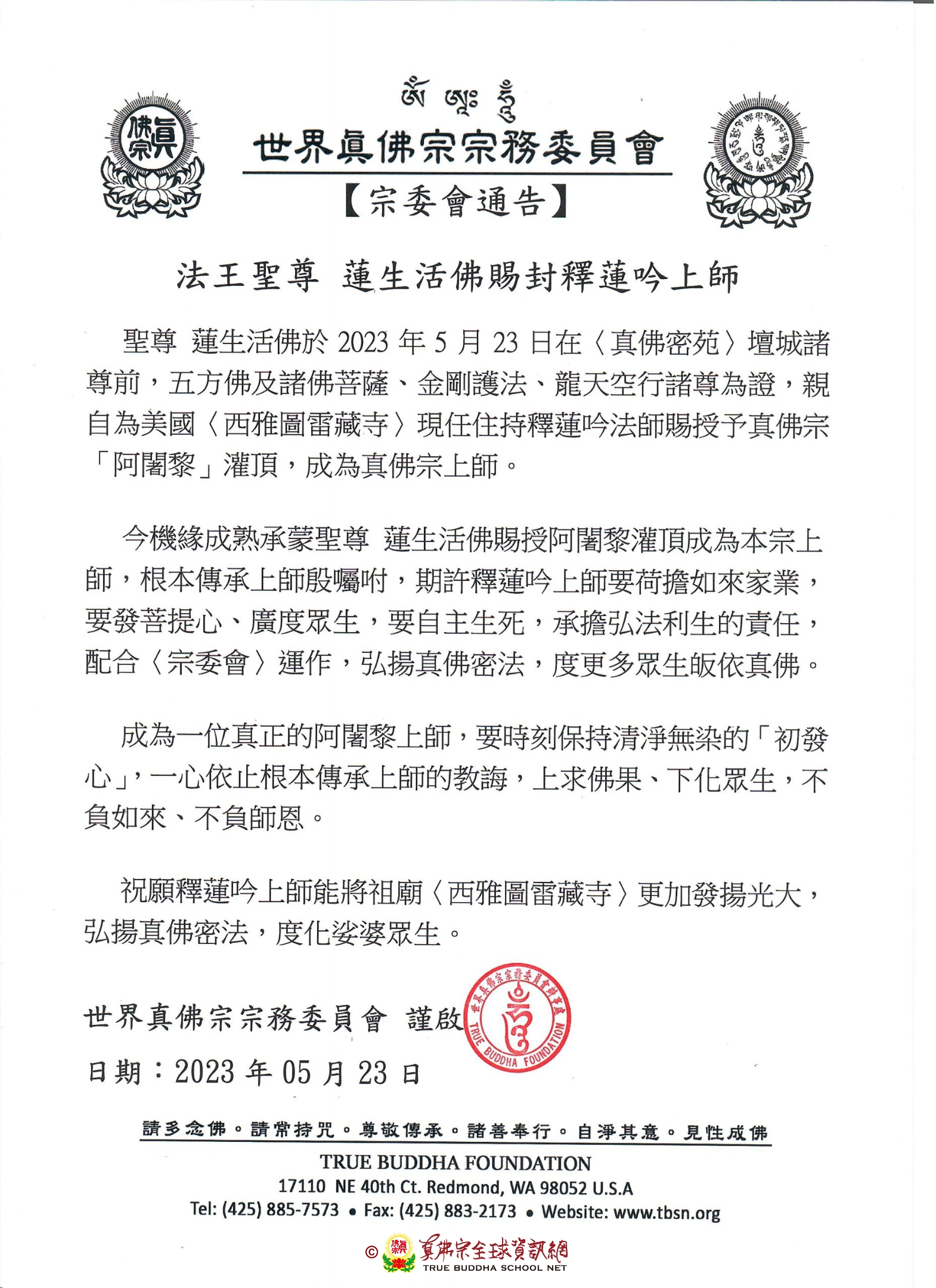 聖尊 蓮生活佛於2023年5月23日在〈真佛密苑〉壇城諸尊前,五方佛及諸佛菩薩、金剛護法、龍天空行諸尊為證,親自為美國〈西雅圖雷藏寺〉現任住持釋蓮吟法師賜授予真佛宗「阿闍黎」灌頂,成為真佛宗上師。