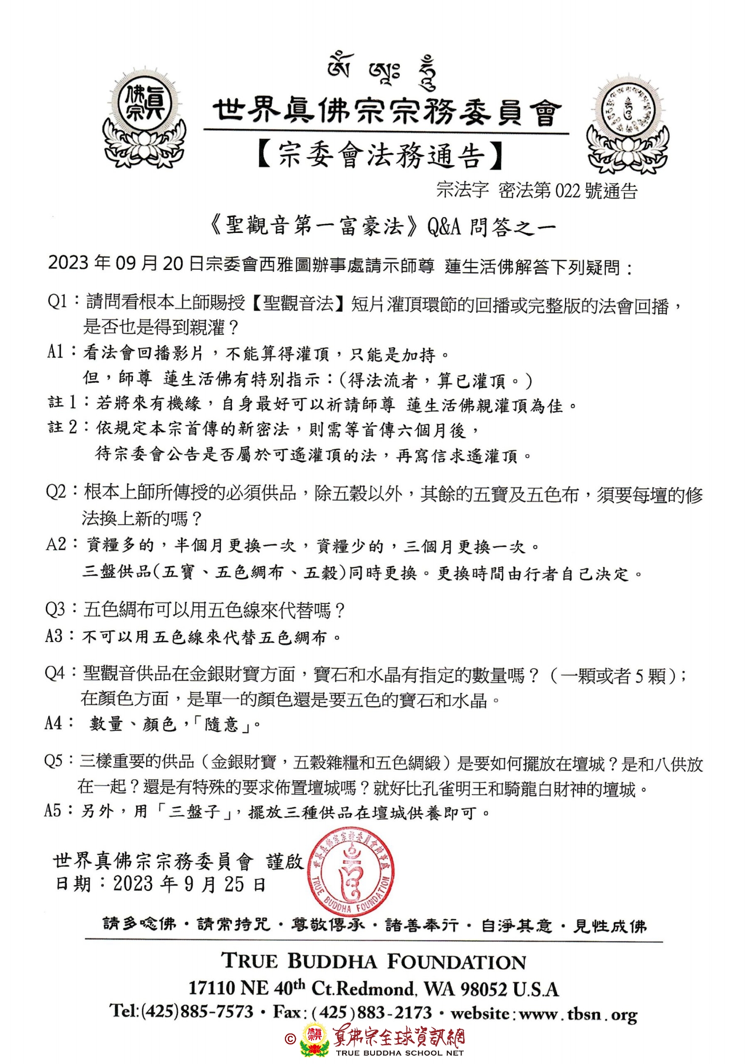 【宗委會法務通告】 「聖觀音第一富豪法」 Q&A問答之一