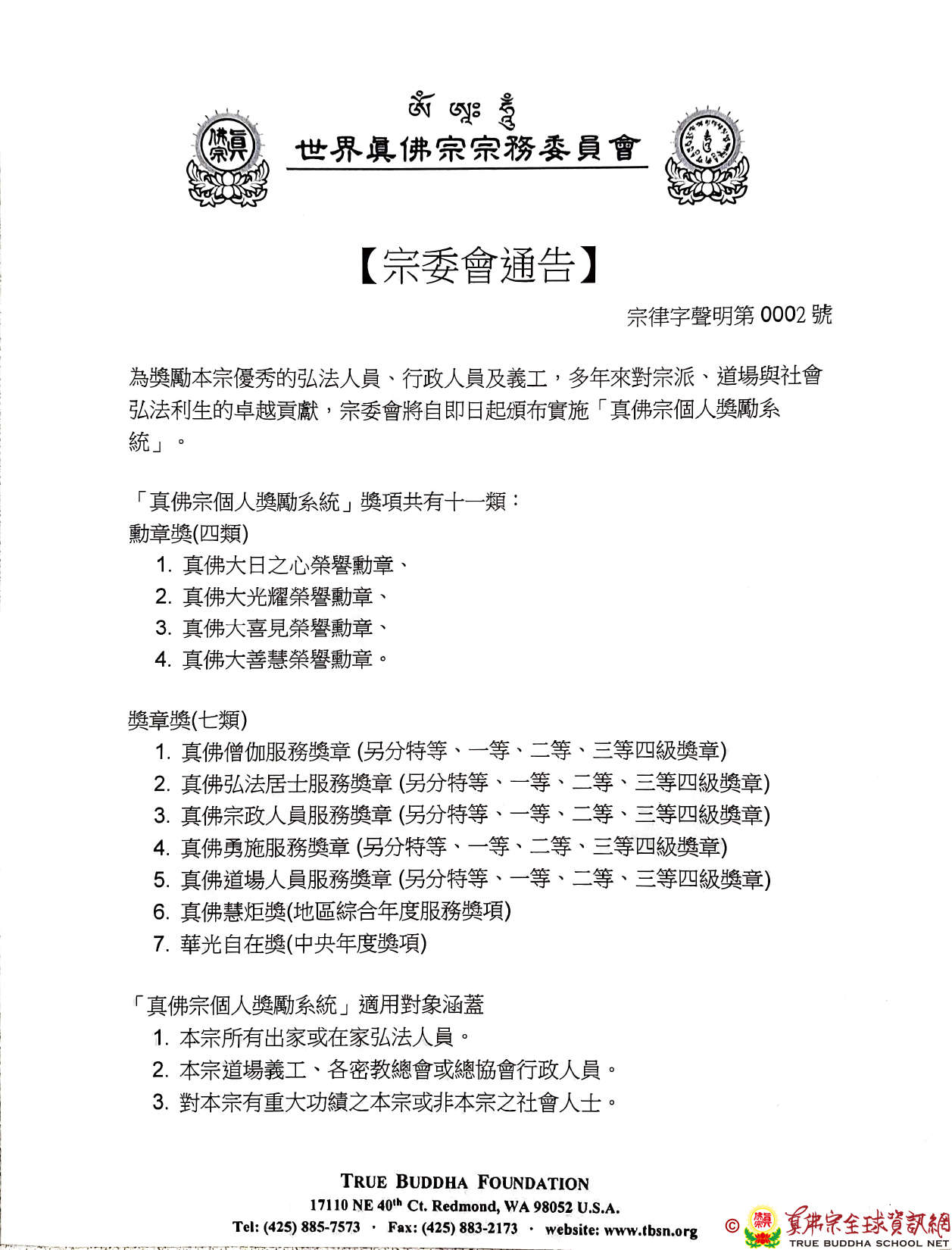 「真佛宗個人獎勵系統」各類獎項實施細則,會陸續刊登在「真佛宗務網站」中,並將收錄於最新版的「真佛宗章程守則」中。