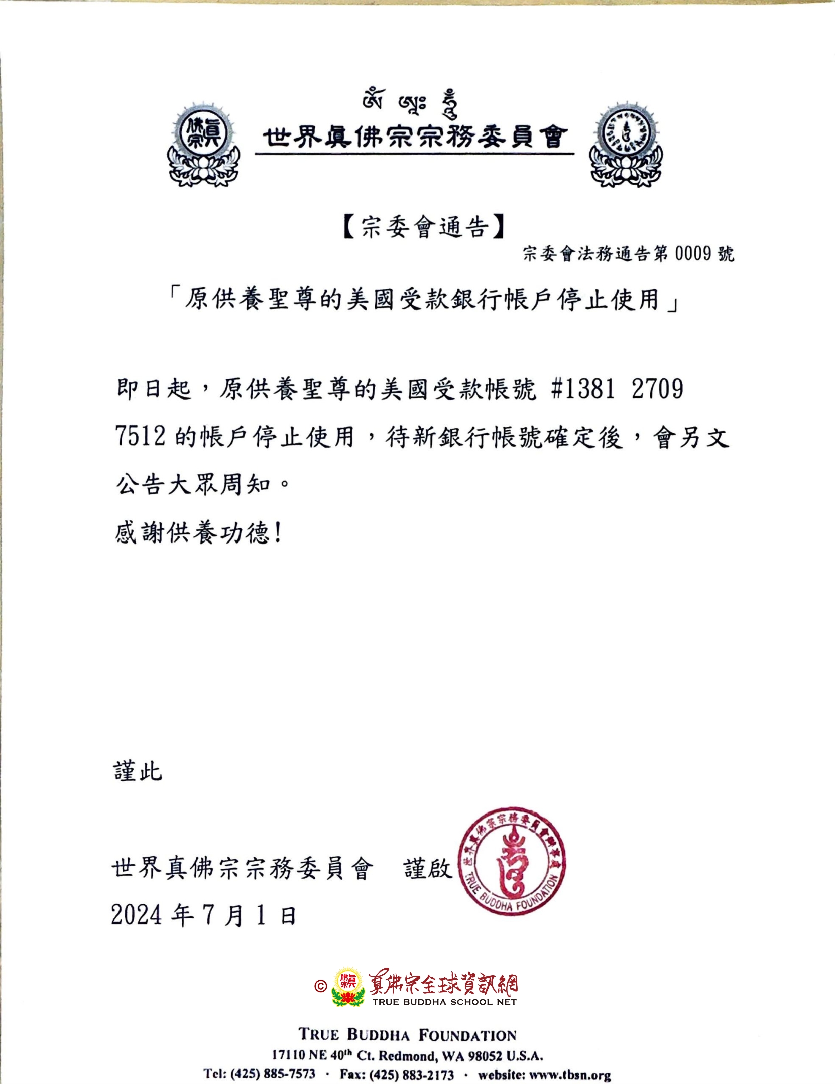 即日起,原供養聖尊的美國受款帳號 #1381 2709 7512的帳戶停止使用,待新銀行帳號確定後,會另文公告大眾周知。