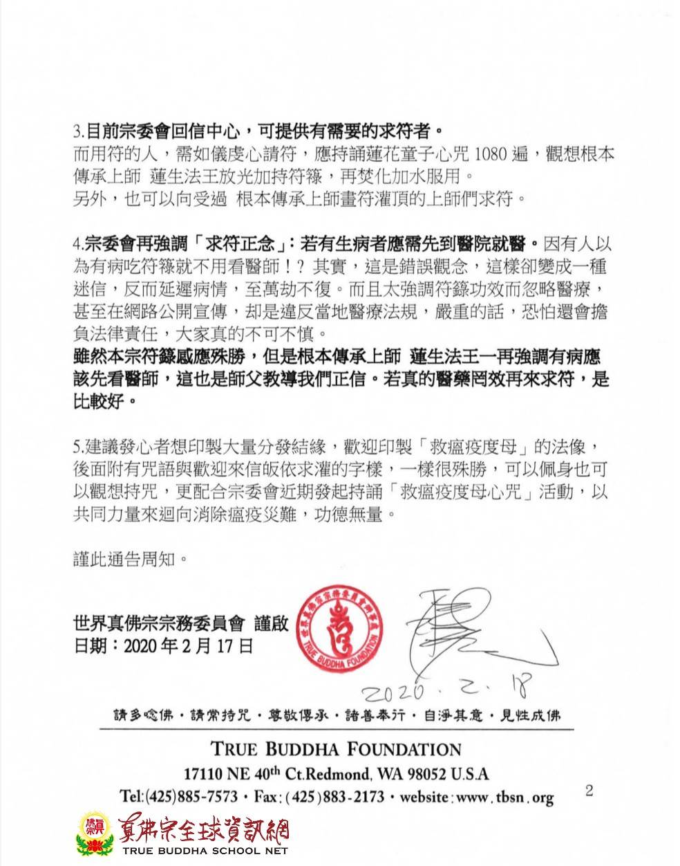 4.宗委會再強調「求符正念」:若有生病者應需先到醫院就醫。因有人以為有病吃符簶就不用看醫師!? 其實,這是錯誤觀念,這樣卻變成一種迷信,反而延遲病情,至萬劫不復。而且太強調符籙功效而忽略醫療,甚至在網路公開宣傳,却是違反當地醫療法規,嚴重的話,恐怕還會擔負法律責任,大家真的不可不慎。